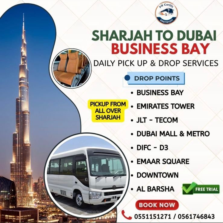Travel comfortably from Sharjah to Dubai Business Bay with ourdaily pick and drop service. Pickup from all areas of Sharjah, multiple drop points, and a free trial available.